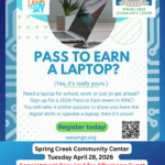 Our Pass to Earn a Laptop event is coming up April 28th!There is no time listed for this event because you MUST fill out the survey to receive an appointment!They are doing the registration this way so that they have computers available for everyone that shows up – they don’t want anyone to leave disappoin , ...