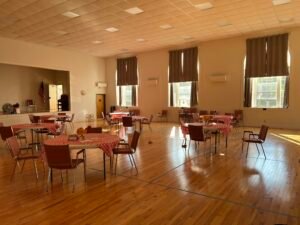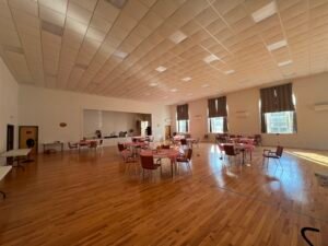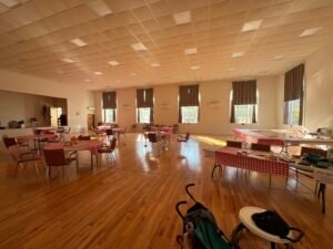 Our gymnasium is a large space with wood flooring, great lighting, and an amazing stage. Bathrooms are immediately outside the hallway doors. The rental agreement details expectations for set-up and take-down of the event.
