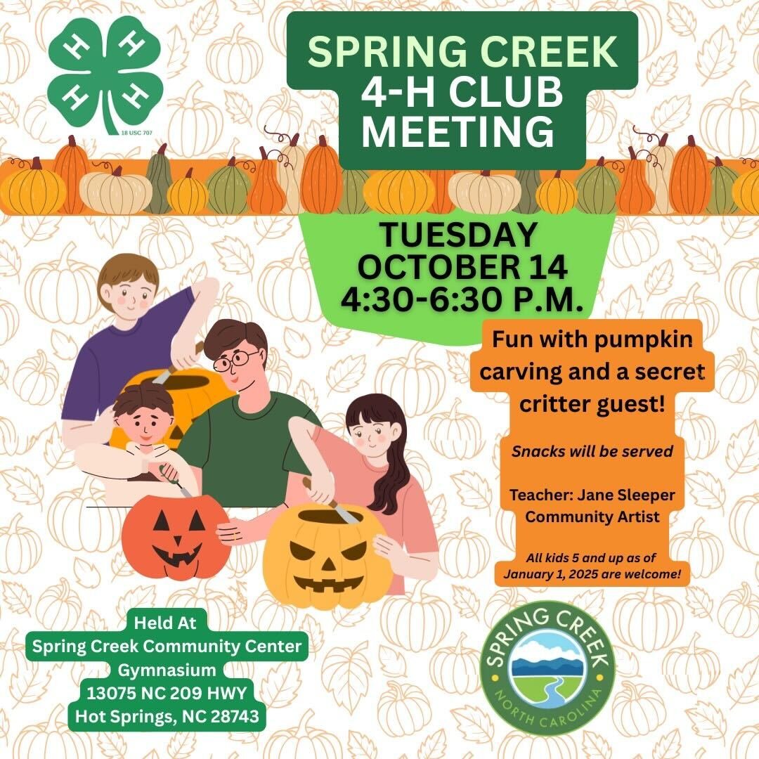 Join us for a meeting of the Spring Creek 4H Club! This month’s meeting will feature pumpkin carving with Jane Sleeper, community artist.