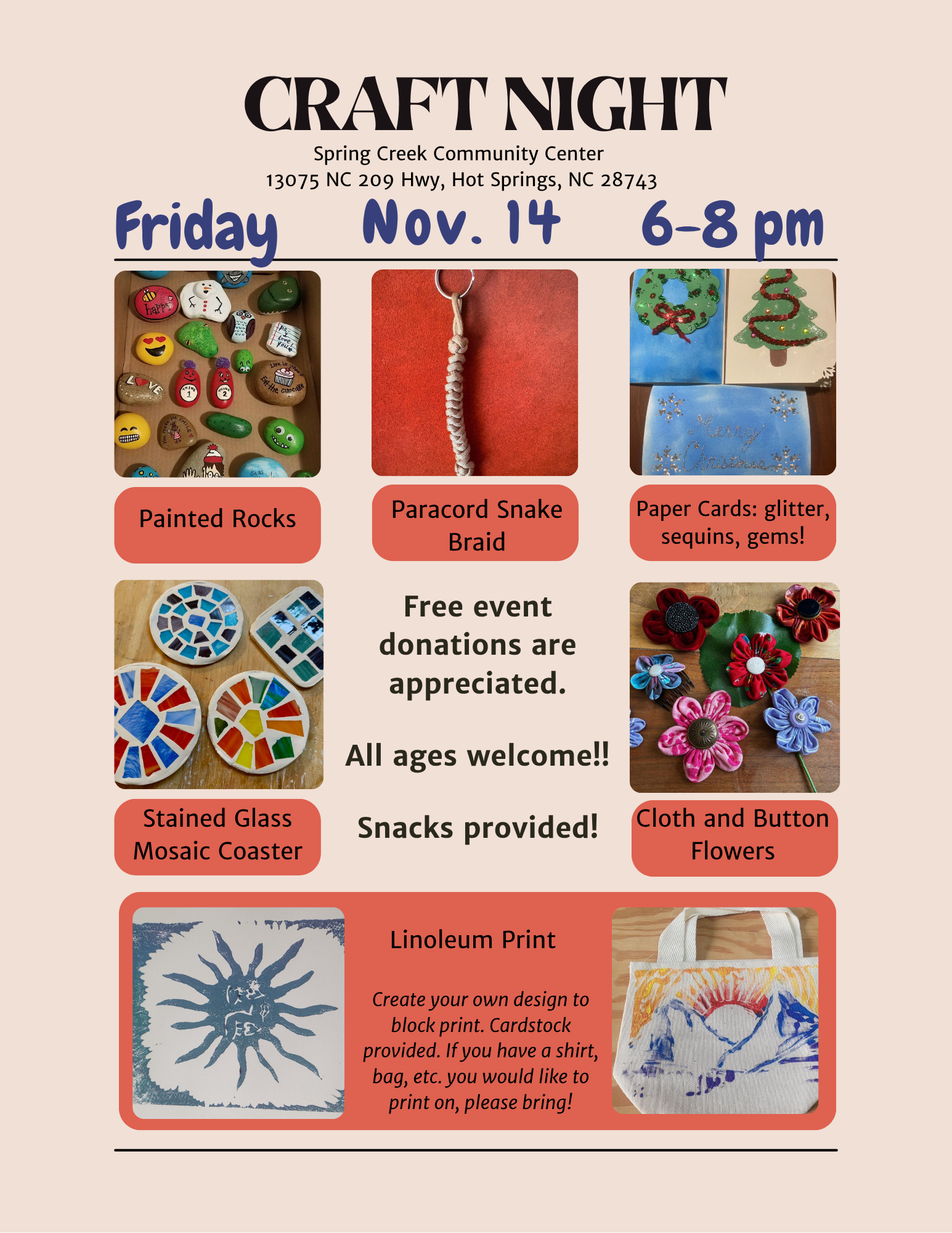 Come make crafts in the community center gym. Volunteers from the community will have materials and ideas to help you make beautiful handmade crafts.