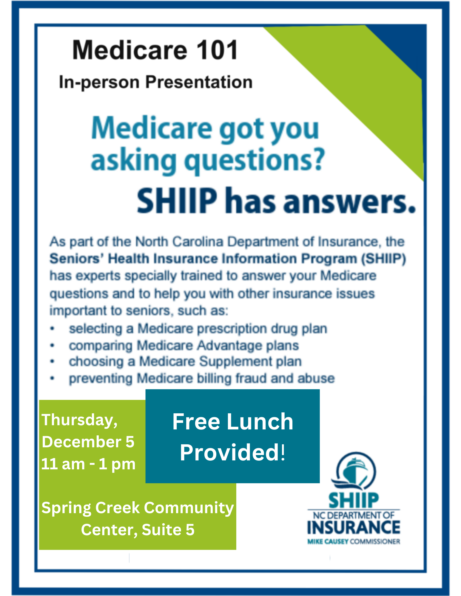 Dee Bolin with the Hot Springs Medical Program will give an in-person presentation at SCCC about Medicare. She will answer your enrollment questions and how to pick the best plan for you. Dee works with SHIIP, Seniors’ Health Insurance Information Program. The presentation includes free lunch.